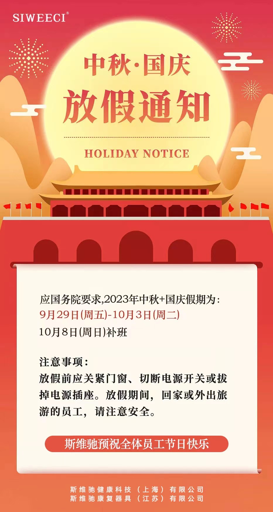 放假前应关紧门窗、切断电源开关或拔掉电源插座。 请各部门提前安排好工作,做好放假期间的后勤保障工作。